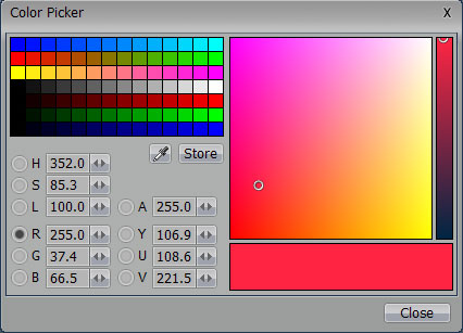 Renk seçici (Color Picker) renk paletinin elektronikleşmesinden bu yana, grafik düzenlemelerinde en çok kullanılan araçlardan bir tanesi olmuştur. Video Toaster [5]'de ise bildik özeliklerinden çok daha fazla fonksiyon ve güçle donatılarak, çok daha kullanışlı hale getirilmiştir. Başlangıç olarak, RGB renk sisteminin yanı sıra, Video ile ilgilenenler için çok daha önemli olan YUV renk sisteminde de çalışma özelliği benzeri araçlardan ayrılmasına sebep olmaktadır. Aynı zamanda renkleri Hue, Saturation, ve Value modunda da seçmeniz mümkündür. Bu özellik paletinizin tam siyah (Super Black) ya da tam beyaz (Super White) gibi RGB renk sisteminin sınırlarının dışında yer alan ve video çalışmaları için kullanışlı olan renklere kolayca ulaşmanızı sağlar. |