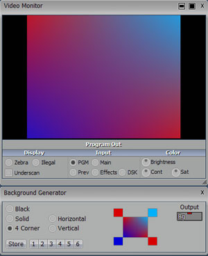 Ekranın dört köşesinde farklı renkleri belirlemek ve bunlar arasındaki geçişide yumuşak olarak gerçekleştirmek, renk seçiciden, renk seçmek kadar kolaydır. Hatta siz renk seçenekleri arasında dolaşırken, sonucu aynı anda (real-time) hem program çıkışından hemde Video monitör'den izleyebilirsiniz.